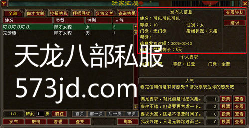玩家点击“结识”按钮可以将该玩家加为临时好友并可以发送文本信息;点击“查看资料”按钮,可以查看当前所选玩家的头像、级别、门派等详细资料;可以进行当前类型的查找;可以通过此平台发布征友信息,信息不能重复发布。玩家可以随时对发布的信息,进行“撤消”和“管理”。玩家发布信息后,有7天有效期,有效期到达后系统将会撤销此条信息,并会同时对该玩家发送一封系统邮件。玩家还可以就某类型的信息进行投票。