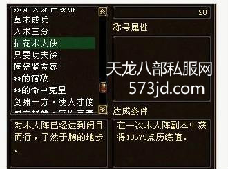 6:木人阵称号----通过一个一诞生就被遗弃的副本拈花木人阵获得,在副本中用特定的技能击杀木人,所有队友要击杀同色木人即可得分,得分到达目标可以获得称号,最高级为拈花木人侠,20阅历值。