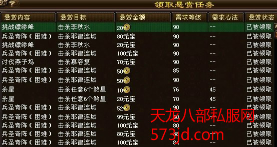目前能够悬赏的任务有杀星,四绝庄,缥缈峰,燕子坞,少室山,兵圣这几种,悬赏任务对于悬赏人来说一旦有人接受了自己的悬赏,则自己就不能再刷那个FB。而对于领取任务的人来说,一旦接受了悬赏,且完成了任务,自己也不能刷那个FB了。